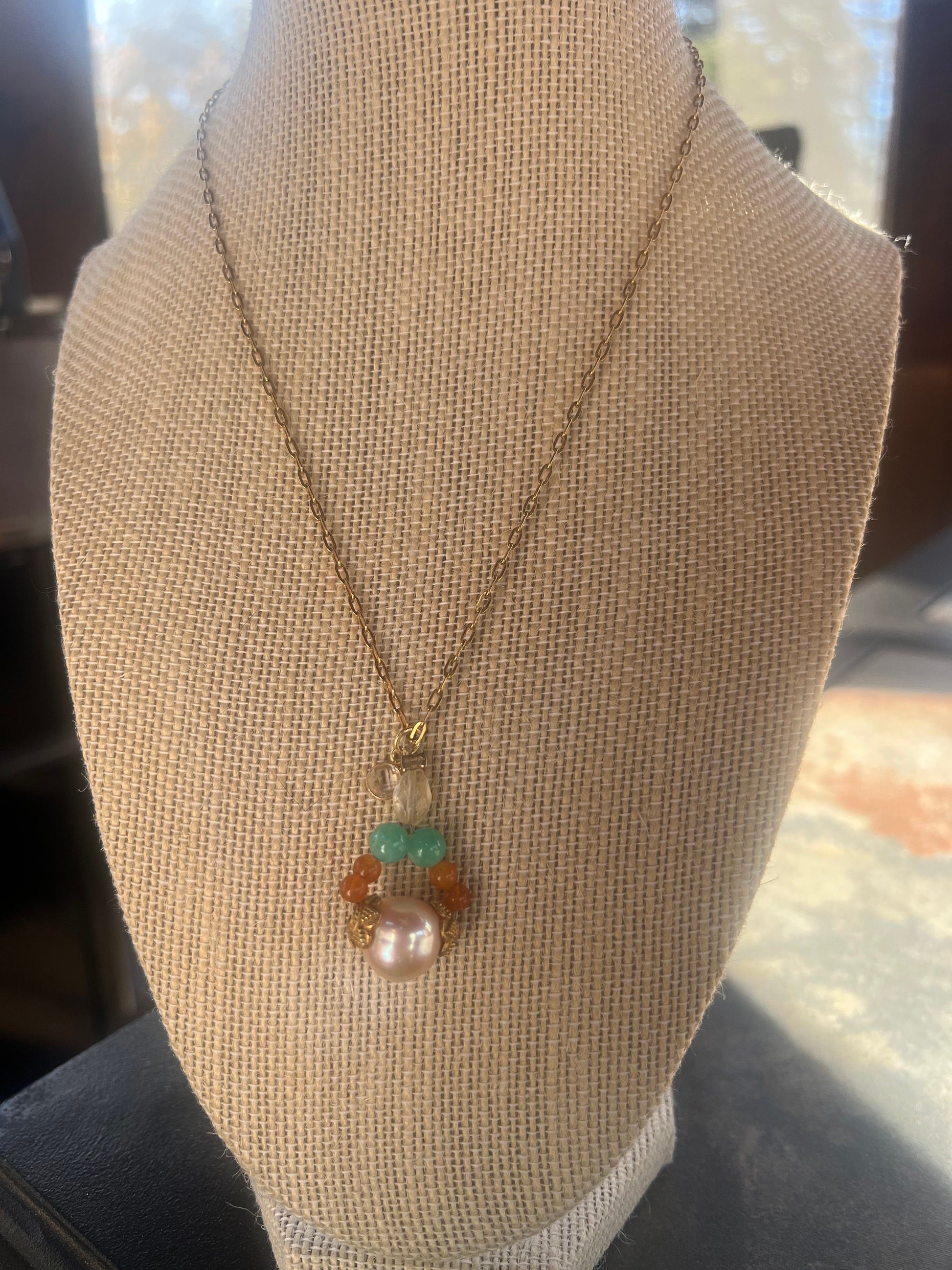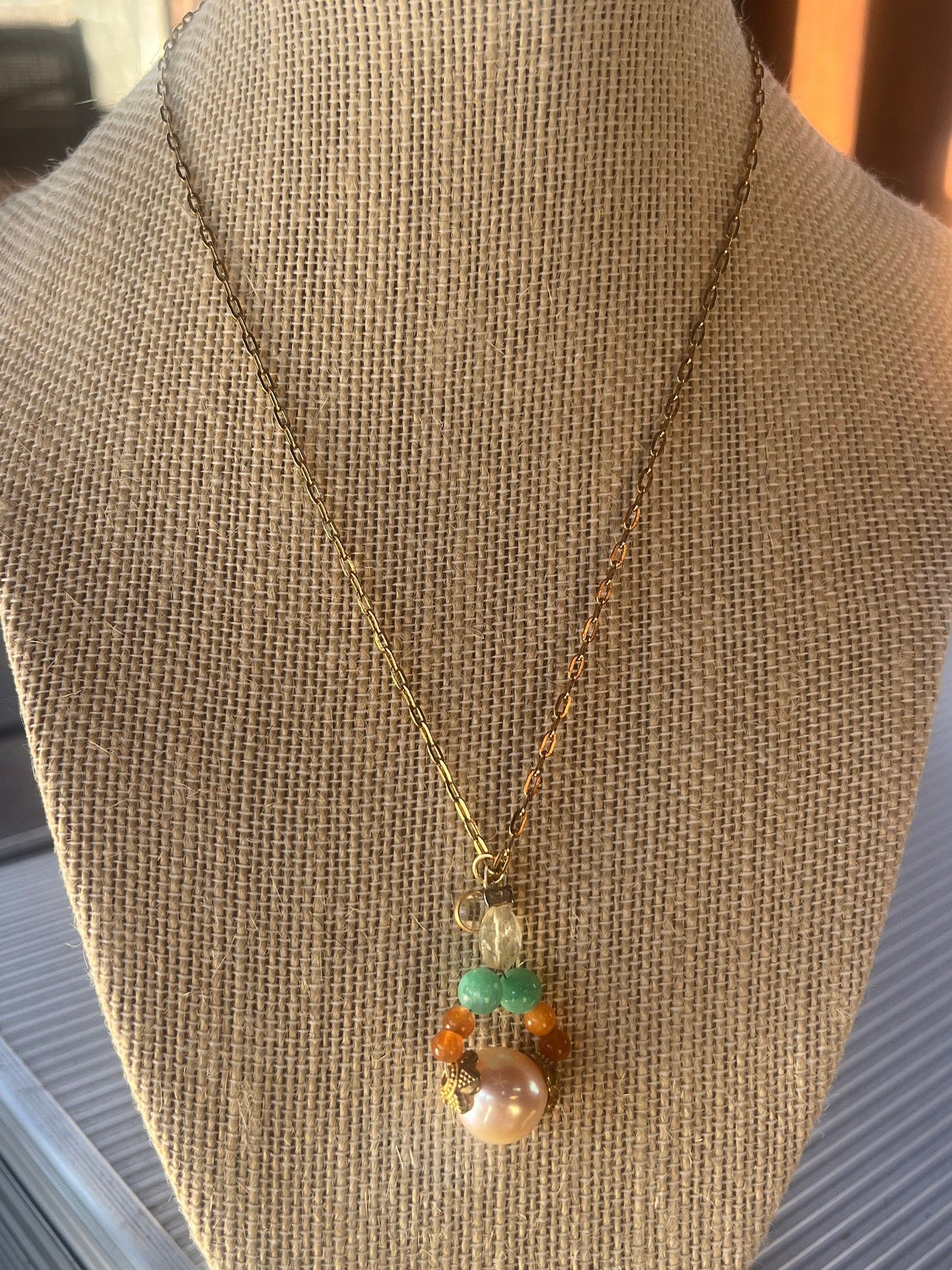 Natural Peach FW pearl with orange and aqua quartzite, 2-3 mm. 2mm paperclip necklace, 16”, gold plated with spring ring. Facetted citrine.