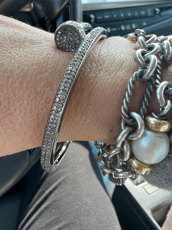 High-style and coveted, this industrial nail bangle filled with sparkly diamonds is a treasure to wear alongside your other cuffs, your sterling silver links, or with your rose gold.